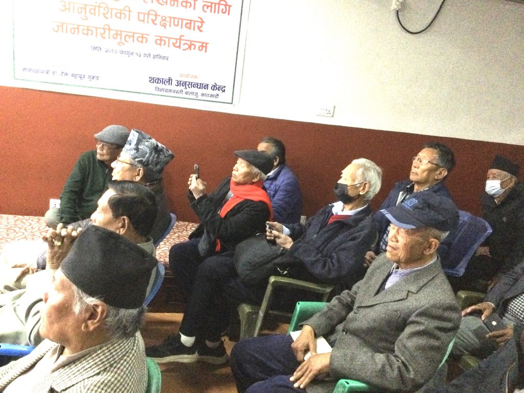 डा.गुरूङज्यूद्वारा आनुवंशिकीबारेकाे प्रस्तुतिकरणले कुनै पनि समुदाय वास्तवमा कुन वर्ण भित्र पर्छ ? भन्ने कुरा उक्त (DNA) आनुवंशिकी पत्ता लाग्ने कुरा जानकारी गराउनु भएकाे थियाे । कार्यक्रमका प्रमुख अतिथि थकाली सेवा समिति नेपाल केन्द्रका अध्यक्ष श्री गजेन्द्र तुलाचनज्यूले डा.टेकबहादुर गुरूङज्यूलाई आनुवंशिकीबारेकाे जानकारी गराउनु भएकोमा धन्यवाद व्यक्त गर्दै थकाली समुदायको (DNA) आनुवंशिकी परिक्षण ४० क्ह्यूबाट नै लिदाँ उपयुक्त हुने कुरा सुझाब दिनु भएको थियो ।